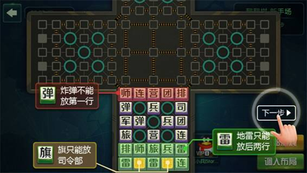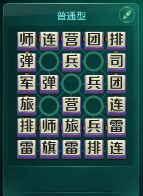在进行单挑暗棋游戏之前会提示玩家进行布局,即将25枚棋子分别摆放在自己范围内的23个兵站和两个大本营中,炸弹不能放在一线,地雷只能放在最后两线,军棋只能放在大本营。这个将会作为玩家的开局阵型使用。玩家可以在此导入之前预设的布局。