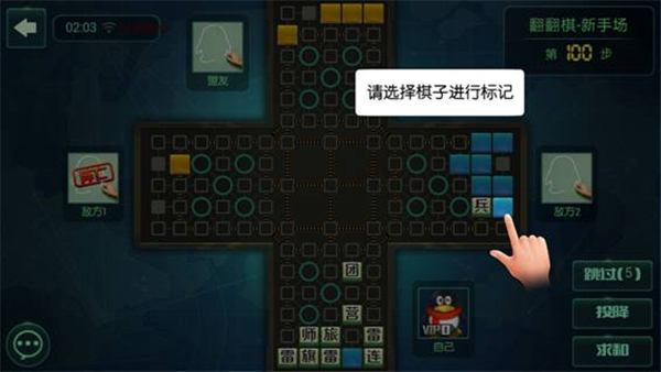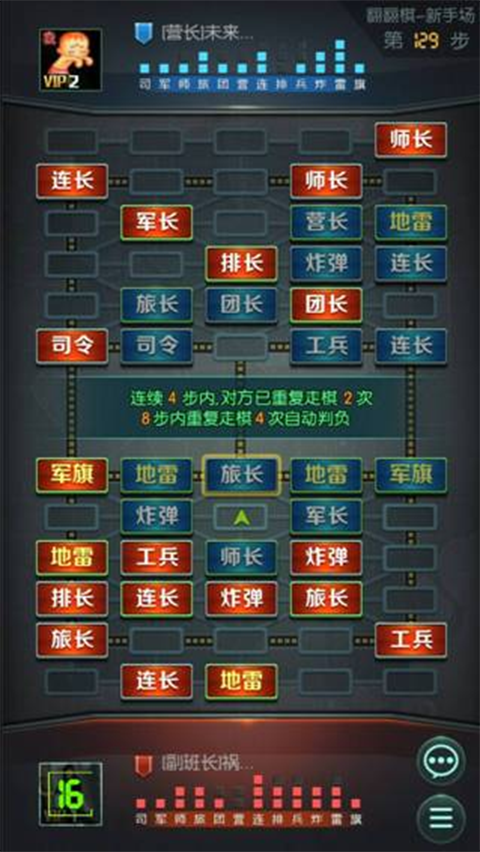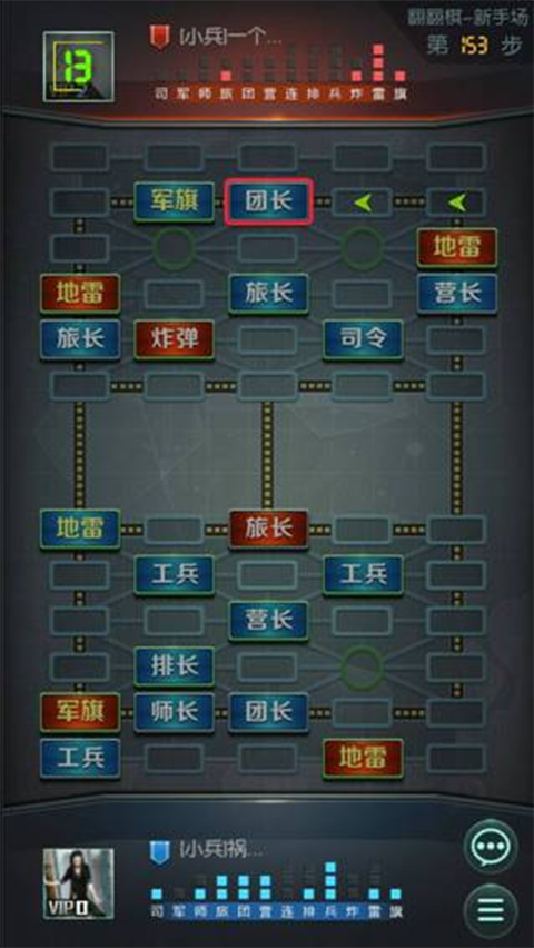 玩家通过点击选中自己级别高的棋子吃掉对方级别低的棋子,一回合内只能走棋或者翻棋一次。双方存活的棋子可以通过各自角色名字下面显示的提示查看,点亮的图标为存活的棋子。并可以通过右下角的聊天图标和对面玩家聊天。