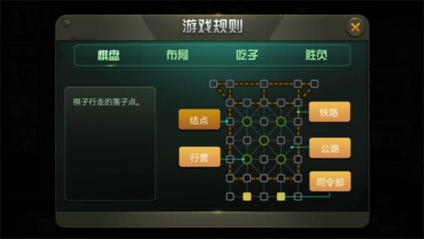 棋盘上行走路线包括公路线和铁路线,显示较细的是公路线,任何棋子在公路线上只能走一步;显示为粗黑的为铁路线,铁路上没有障碍时,工兵可在铁路线上任意行走,其它棋子在铁路线上只能直走,不能转直角弯。棋子落点包括结点、行营、两个大本营。行营是个安全岛,进入以后,敌方棋子不能吃行营中的棋子。军棋和地雷不能移动。