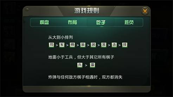 司令> 军长 > 师长 > 旅长 > 团长 > 营长 > 连长 > 排长 > 工兵,小棋遇大棋被吃,相同棋子相遇,则同归于尽;工兵能排除地雷,其他棋子不能排雷;炸弹与任何棋子相遇时同归于尽。