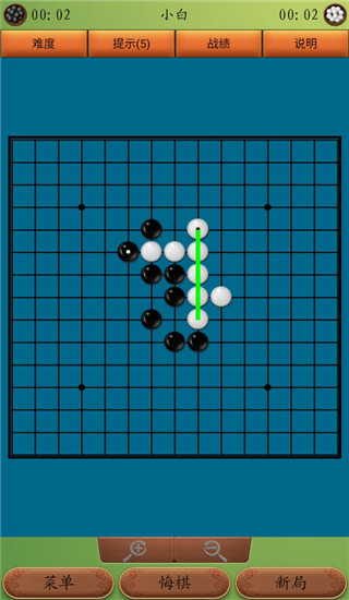 与ai进行对战,其难度可以自由的设置,提供给了黑子和白子的提示点;
