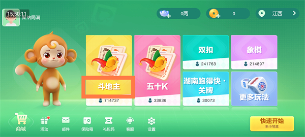 进入游戏主界面后,你可以选择多种热门牌类玩法,如斗地主、五十K等。点击对应的模式即可进入专属玩法专区。