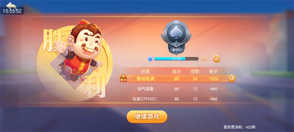 每局结束后,系统会展示胜负结果、底分、倍数、银两收益以及段位积分变化。点击“继续游戏”即可快速开始下一局。