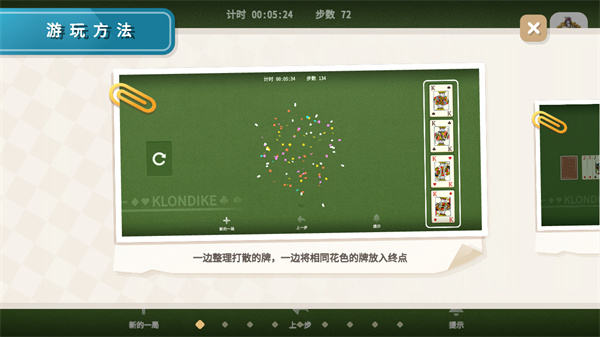 1、一边整理打散的牌,一边将相同花色的牌放入终点;