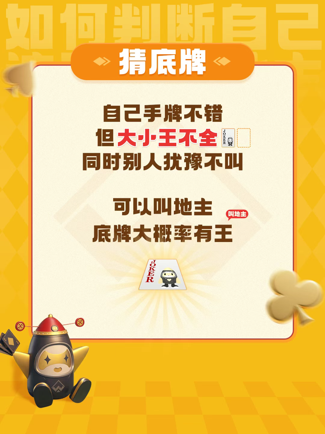 自己手牌不错,但大小王不全,同时别人犹豫不叫,那么底牌大概率有王,可以叫。