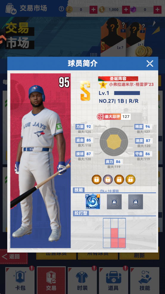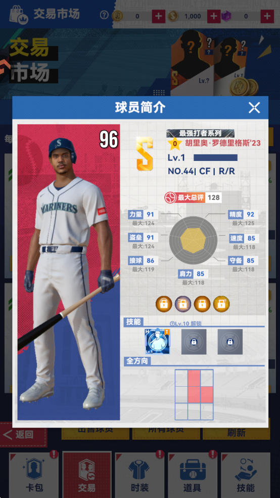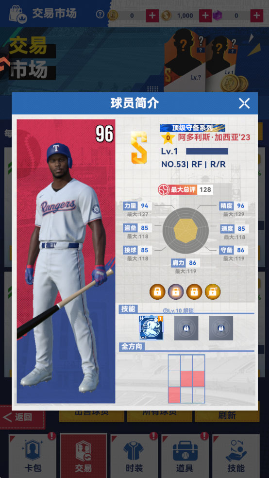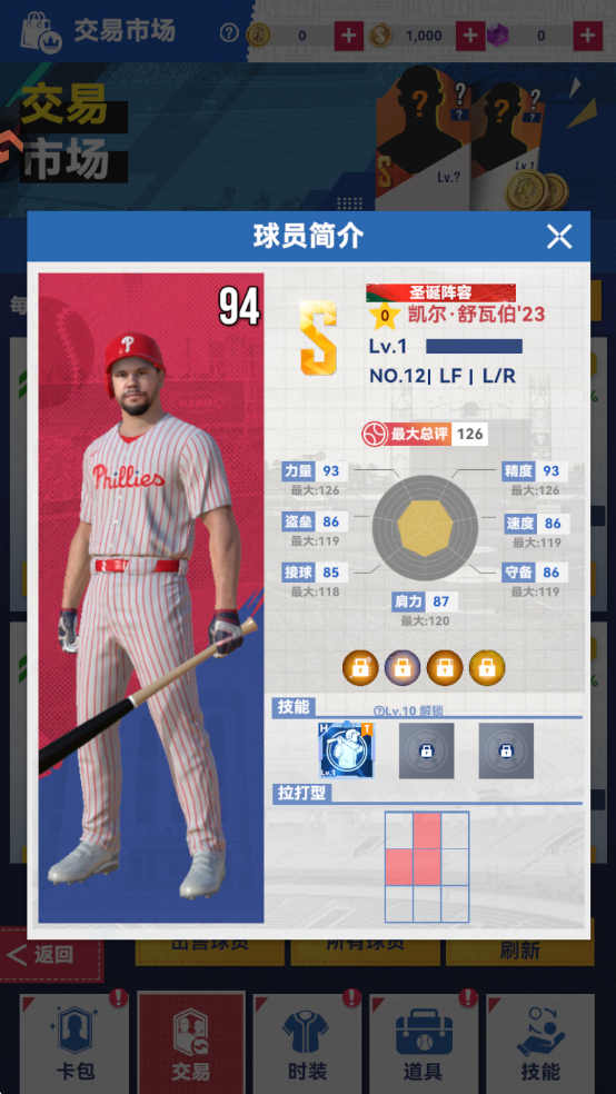 技能:【翻转球棒Lv.1】在比分打平且有2个出局时,有50%几率力量和精度增加30。
