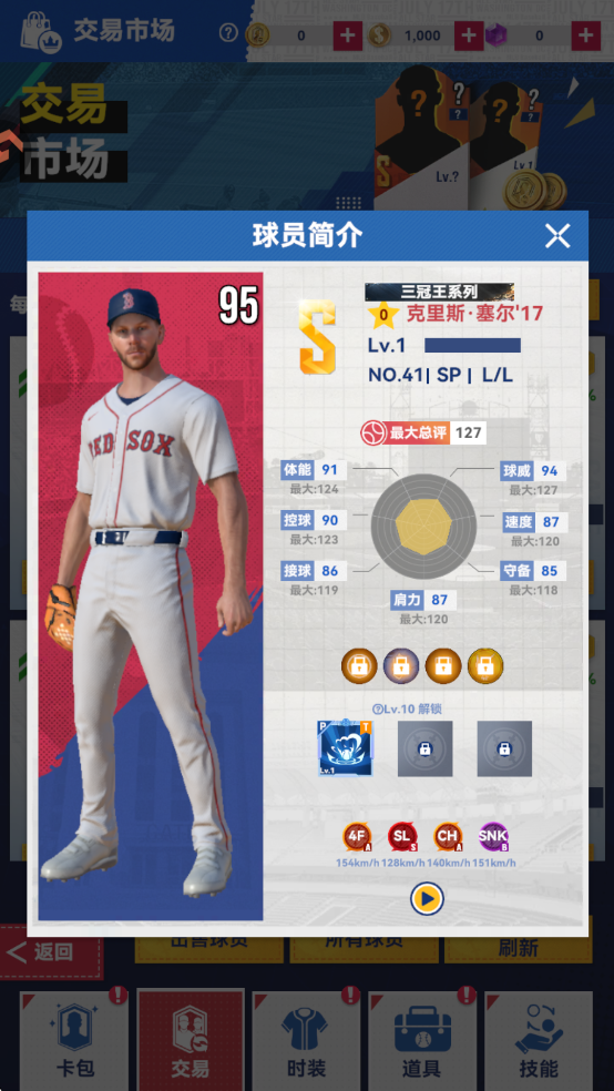 技能:【曲球打者Lv.1】在比分领先且2B、3B上有人时,有50%几率对方投球位移量减少1。