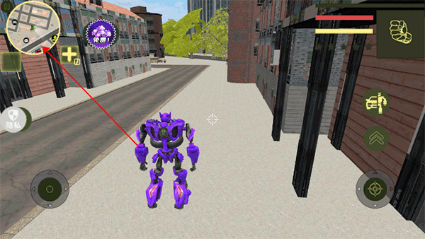 3、点击右侧这个按钮,英雄人物就可以直接变身成为一辆汽车开始跑酷追击敌人,再点击一下就可以变身机器人展开战斗。