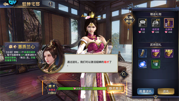 给武将送礼提升好感度,激活专属雄才技能,每日可免费领取招募券,稳定补充抽卡资源。