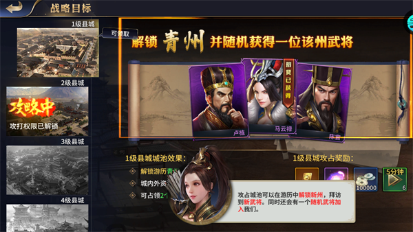 攻占不同等级县城解锁对应州域,可随机获得该州武将,同时解锁新资源与城池增益,推进大地图战略。