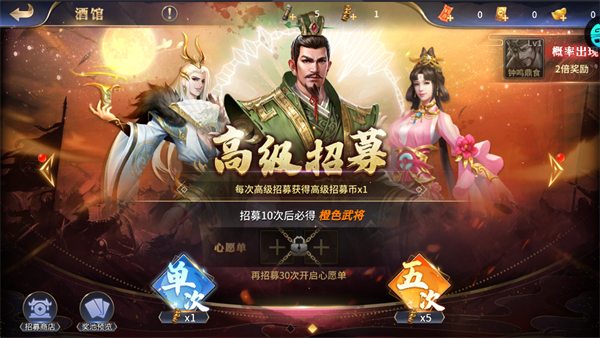 高级招募10次保底必出橙色武将,累计30次可开启心愿单,精准定向获取心仪武将。