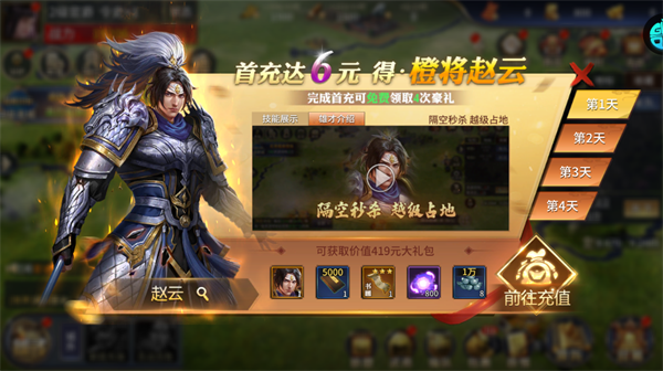 游戏内置0.1折福利,首充6元只需要0.06即可领取橙将赵云,还能解锁4天连续豪礼,助力开局越级推图、快速占地。