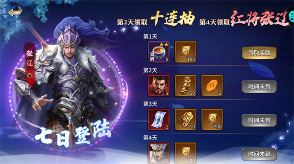 连续登录7天可免费领十连抽、红将张辽等丰厚奖励,是零氪/微氪玩家的核心福利线。
