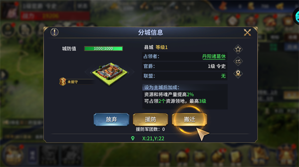 占领分城后可获得资源产量加成,支持搬迁、援防操作,是扩张势力、提升发育速度的核心玩法。
