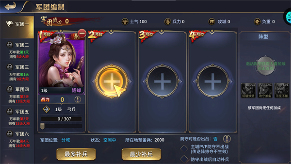 可上阵武将组建军团,搭配兵种与阵型提升战力,分城军团可驻守备战,灵活调配攻防。