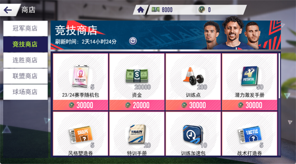 在商店中,可使用赛事获得的货币兑换赛季随机包、训练点、潜力激发手册等资源,助力球队阵容和战术升级。