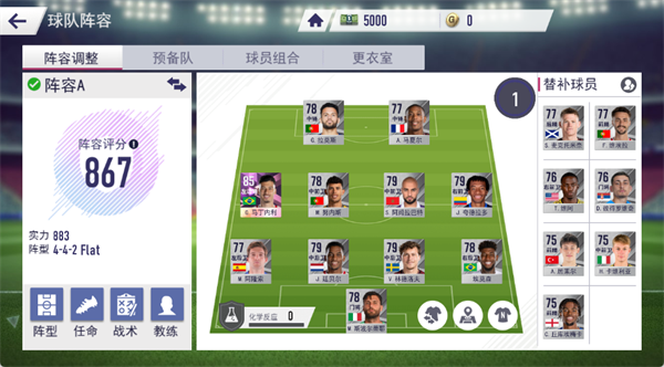 管理球队阵容,可调整阵型(如 4-4-2 Flat)、进行球员任命、制定战术和选择教练,同时关注阵容评分与化学反应,优化球队战力。
